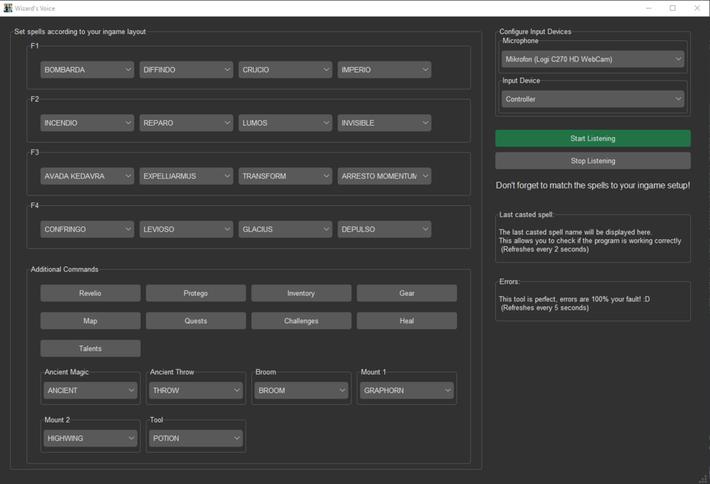 The tool is best used using headphones while playing as it can happen that the ingame sounds might trigger unwanted voice commands.